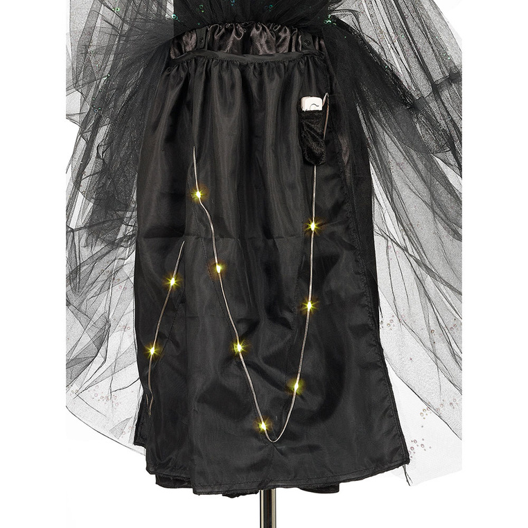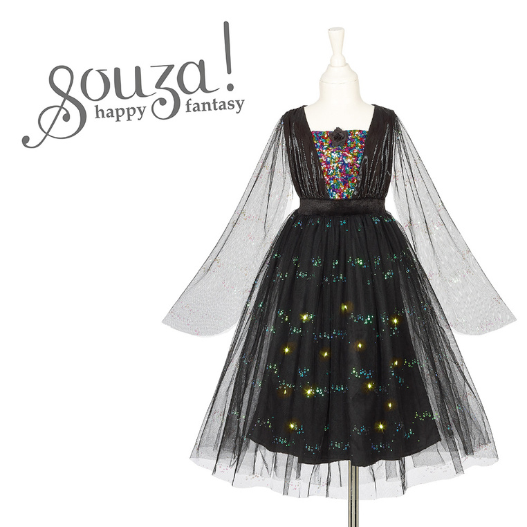 Kostium sukienka z lampkami LED czarownica Agatha holenderskiej marki Souza! to przepiękne i kunsztownie wykonane przebranie dla dziewczynki, które zachwyca dbałością o detale. Sukienka ma klasyczny krój z długimi tiulowymi rękawami, częściowo ozdobionymi cekinami. Góra wykonana jest z różnych materiałów i zdobiona wstawką z kolorowych cekinów na dekolcie. Wielowarstwowa czarna spódnica posiada natomiast: wierzchnią warstwę tiulu ozdobioną cekinami, odpinaną warstwę z przewodem i bezpiecznymi lampkami LED oraz satynową podszewkę zapewniającą wygodę. Dzięki gumce w pasie sukienka jest wygodna i komfortowa w noszeniu.