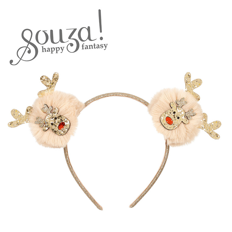 Opaska świąteczna z pomponami z brokatową aplikacją reniferów holenderskiej marki Souza! Pokrytą złotym materiałem, cienką (0,8 cm), metalową opaskę zdobią dwa beżowe pompony, każdy z buźką i rogami renifera pokrytymi złotym brokatem. Opaska jest lekka, delikatna i przyjemna w noszeniu (nie uciska). Idealna na okres adwentu i wszystkie świąteczne przyjęcia. Sprawdzi się także jako stylowy prezent.