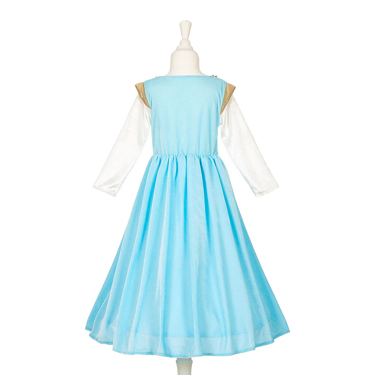 Kostium księżniczki Josephina marki Souza! to elegancka sukienka dla dziewczynki o rozkloszowanym kroju i długich rękawach. Utrzymana w białych i błękitnych odcieniach z satynowym połyskiem, zdobiona jest złotymi haftami i obszyciami, co nadaje jej królewskiego charakteru.